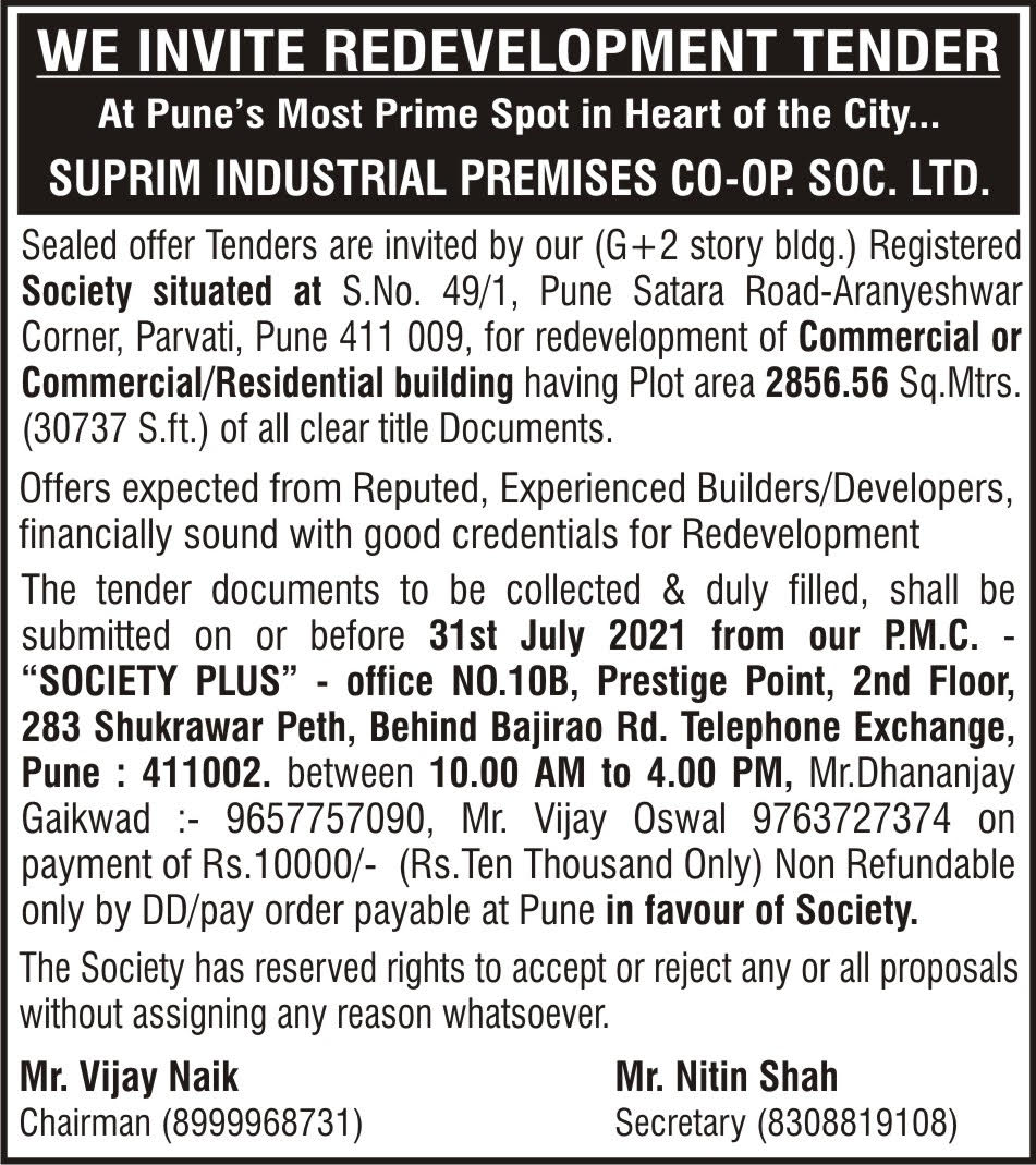 Suprim Industrial Premises Co-Op Society Ltd. situated at Sr. No 49/1, Plot 18, Satara Road – Aranyeshwar Corner, Pune – 411009 has decided to undergo a redevelopment project for their society. Society Plus is chosen as their redevelopment – project management consultant who will guide them through the entire process. The decision to undertake redevelopment was taken in the general body meeting called on 20th January 2021. As the resolution was passed in the meeting and below is the redevelopment committee chosen.